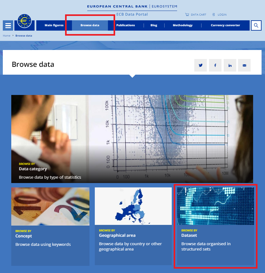 You can browse the statistical data on the ECB Data Portal by datasets, which are organised using a common statistical collection and structure. Click on Browse data in the overhead tab and select Browse by datasets.