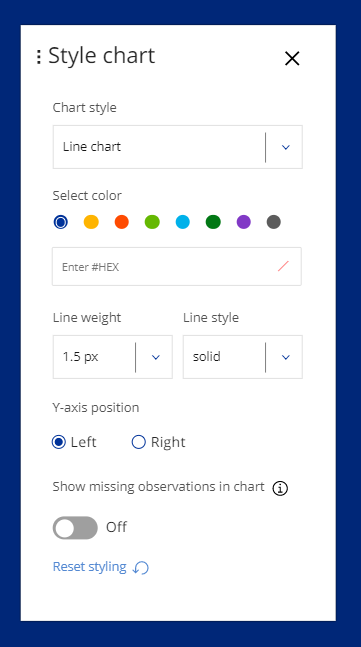 There are many ways you can customise your chart style directly in the time series page. You can open the style palette by clicking the three dots next to the time series and selecting style chart in the drop-down menu.