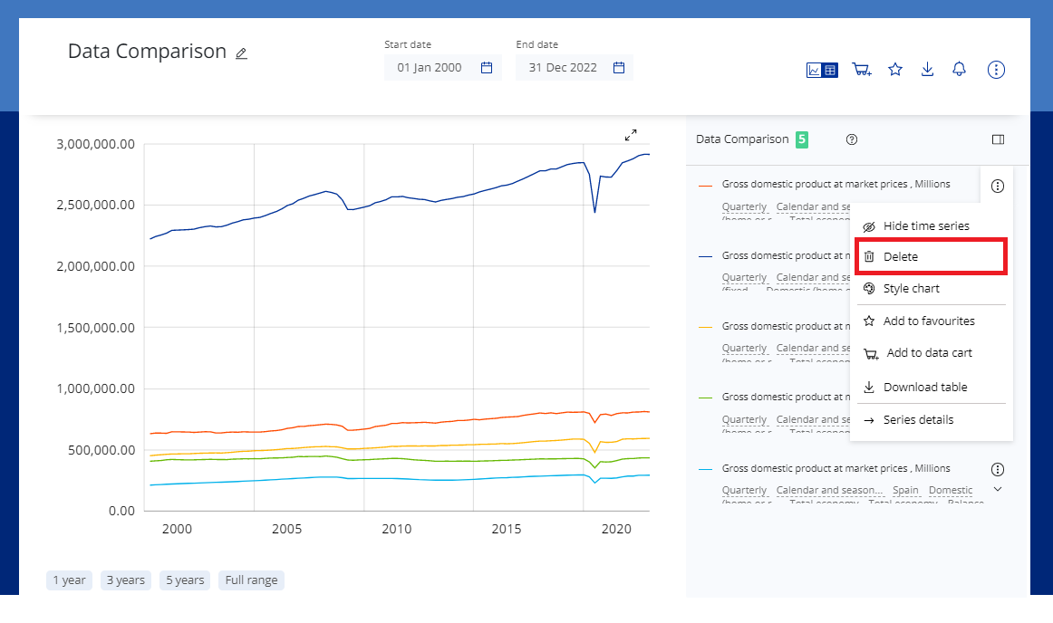 Help Browse graphs articles Exploring Main figures Exploring time series page Exploring data comparison Downloading data Data Graphs Search Account API Contact us Browse Data Graphs Search Account API Contact us Browse graphs articles Remove time series in the data comparison You can remove a time series within your data comparison. Click the three dots next to your desired time series and select Delete in the drop-down menu. Remove time series Image ⏎ Back × Login Register Login Email Password Remember me Forgot your password? Register Register to manage and store your data, data comparisons as favourites, create personalised dashboards or subscribe to email notifications on data updates. Email Password ? Confirm password In what context do you use ECB Data Portal? Please choose oneBusiness professionalEconomic enthusiastJournalistResearcher/AcademicStudentTeacher I acknowledge I agree to the use of my personal data as described in the Data Privacy Statement. Refresh