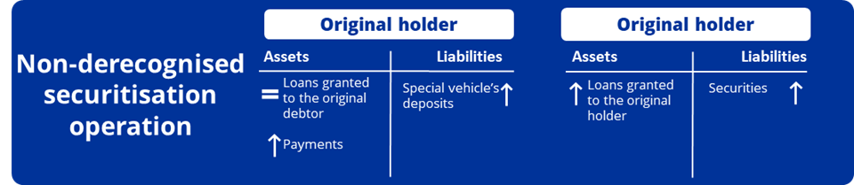 When a securitisation operation is not derecognised, the originator’s balance sheet does not vary to the same extent. The securitised loans remain on the bank’s balance sheet. The bank will also record new liabilities arising from the securities issued, together with an increase on the assets side arising from the payment received. On the financial vehicle corporation’s balance sheet, there is an increase in loans granted (recorded on the assets side), as well as an increase in securitisation units or securitised bonds issued (recorded on the liabilities side).
